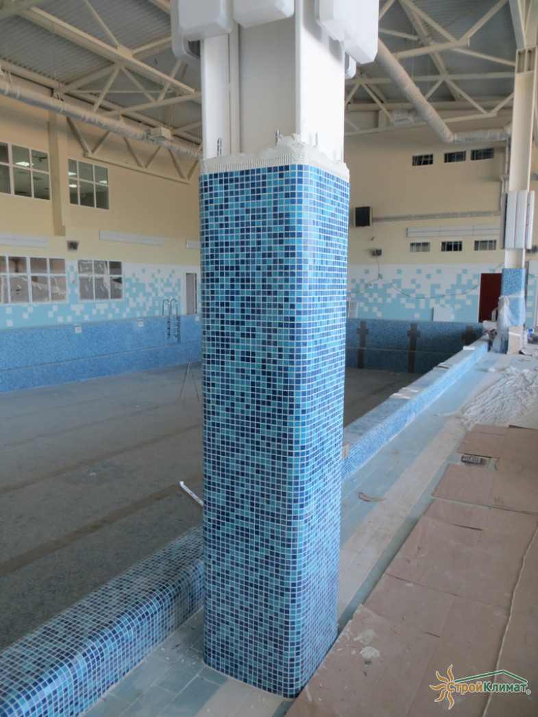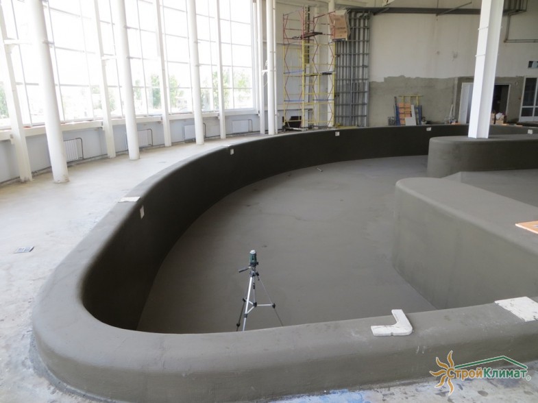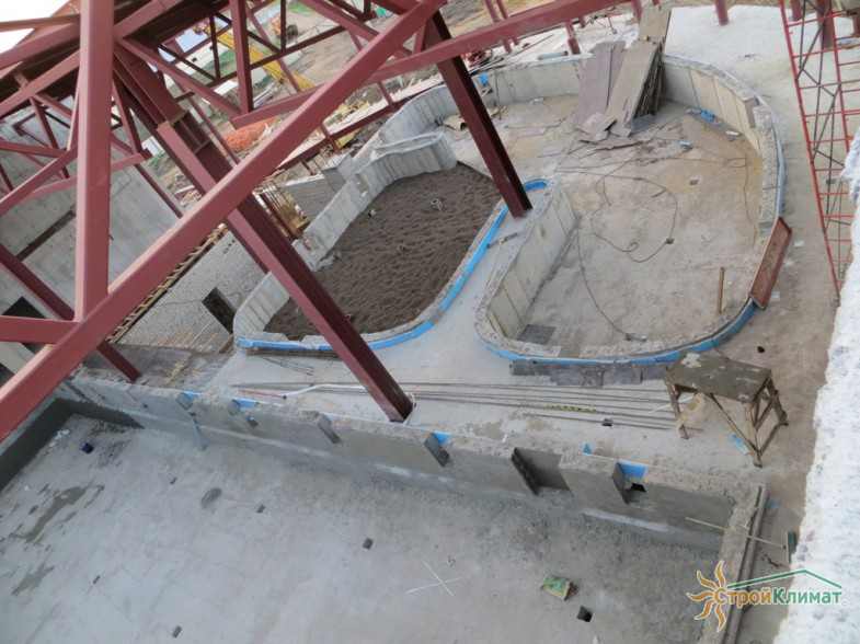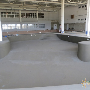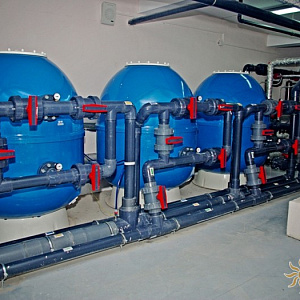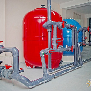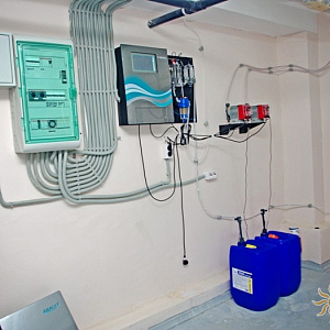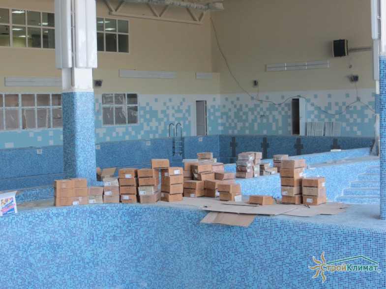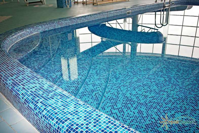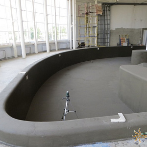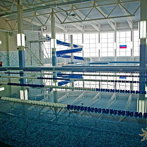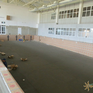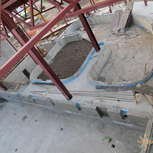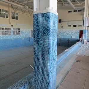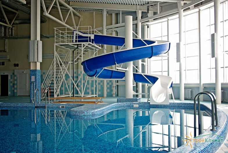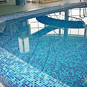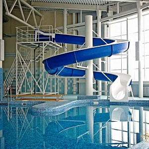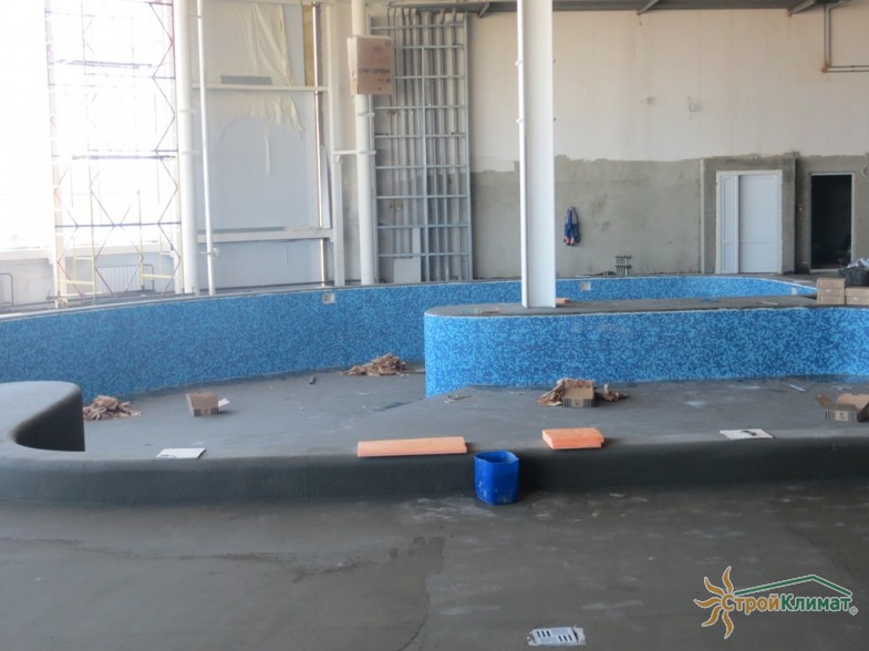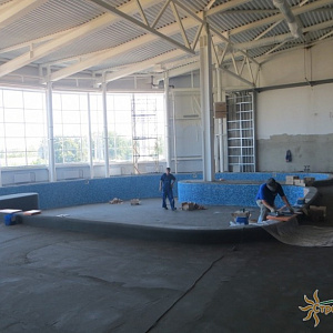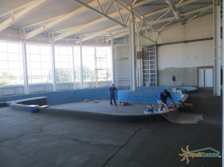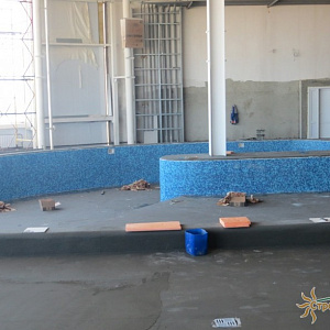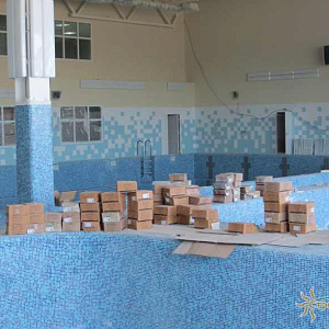 Произведен монтаж бассейна, оборудования водоподготовки, установка водной горки, облицовка чаш бассейна.