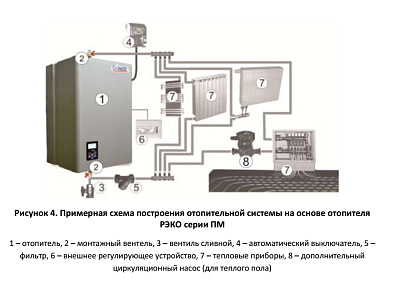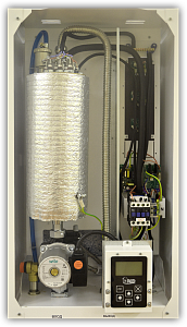 Электрокотлы РЭКО серии ПМ представляет из себя отопитель, укомплектованный циркуляционным насосом (Grundfos - Германия), экспанзоматом (СIMM - ИТАЛИЯ), предохранительным клапаном (KRAMER - Италия) и воздухоотводчиком (VALTEC - Италия).
