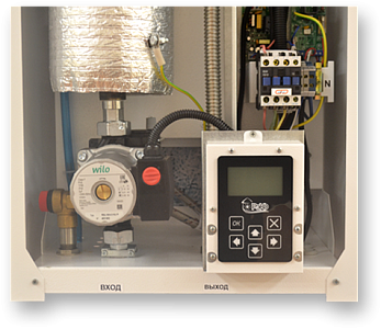 Управление электрическим котлом РЭКО осуществляется при помощи функциональной панели с ЖК-дисплеем, имеющей все необходимые индикации (информация о текущих температурах, режимах работы и неисправностях).