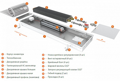 Встраиваемый в пол конвектор Eva KB с принудительной конвекцией - отопительный прибор, в котором установлен медно-алюминиевый теплообменник и тангенциальный вентилятор, тепло от которого передаётся в отапливаемое помещение путём естественной (при выключенном вентиляторе), и принудительной (при включённом вентиляторе) конвекции.