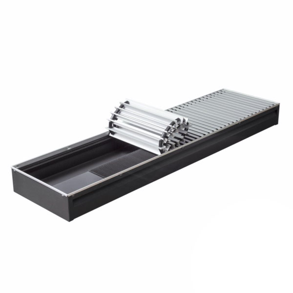 Конвекторы встраиваются в структуру пола, оставляя видимой лишь декоративную решетку из анодированного алюминиевого профиля, полированной нержавеющей стали или ценных пород дерева, которая образует с полом единый дизайн - элемент.
