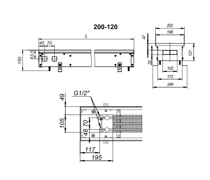 / Внутрипольный конвектор с естественной конвекцией Techno KVZ 200-120-2200