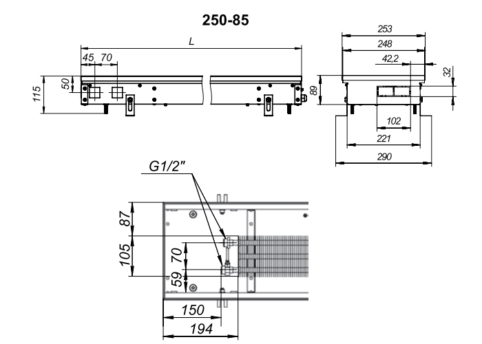 / Внутрипольный конвектор с естественной конвекцией Techno KVZ 250-85-1400