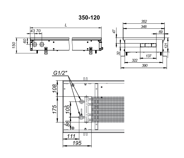 Внутрипольный конвектор с естественной конвекцией Techno KVZ 350-120-1600