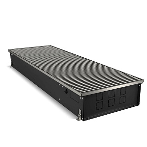Корпус конвектора сделан из оцинкованной стали толщиной 1 мм и не деформируется в стяжке. Специальные фиксирующие перегородки являются дополнительным ребром жесткости и делают корпус ещё прочнее. В центре конвектора установлен отсекатель, чтобы поднимающийся от теплообменника теплый воздух был направлен только вверх для наибольшей теплоотдачи.Корпус окрашен шагреневой краской AkzoNobel фирменного черного цвета Noir Sable. В такой же цвет окрашен теплообменник. Темная окраска корпуса изнутри и декоративные крышки, защищающие зону подключения и зону калача от попадания пыли и мусора, визуально скрывают внутреннюю часть, благодаря чему конвектор эстетично смотрится в интерьере.